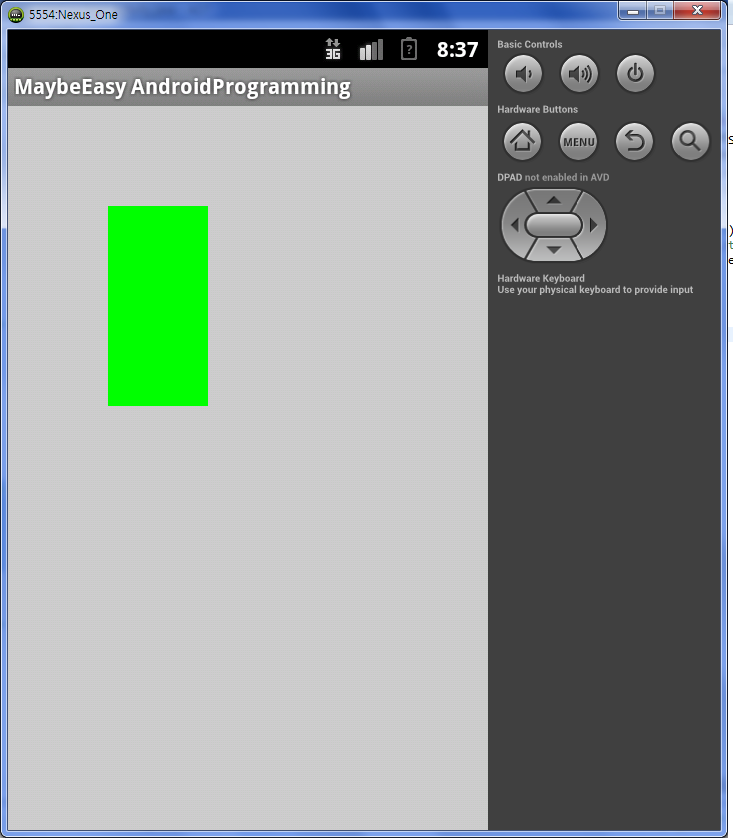 | package naver.maybeeasyandroidprogramming; import android.app.Activity;import android.content.Context;import android.graphics.Canvas;import android.graphics.Color;import android.graphics.Paint;import android.os.Bundle;import android.view.Menu;import android.view.View; public class MainActivity extends Activity { @Override protected void onCreate(Bundle savedInstanceState) { super.onCreate(savedInstanceState); setContentView(R.layout.activity_main); MyView test = new MyView(this); setContentView(test); } protected class MyView extends View { public MyView(Context context) { super(context); } public void onDraw(Canvas canvas) { canvas.drawColor(Color.LTGRAY); Paint p= new Paint(); p.setColor(Color.GREEN); canvas.drawRect(100,100,200,300,p); } }
