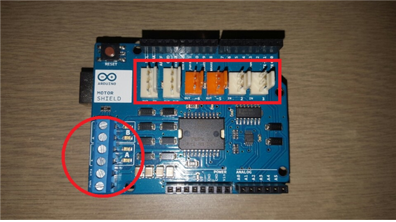 DC모터, 스태핑모터, 서보모터 등을 제어하기 위해서 사용하는 모터쉴드로 L298칩을 이용해서 만들어져있다. 서보모터 같은 경우 아래의 네모 친 부분을 통해서 제어가 가능하며, 스태핑모터와 DC모터 같은 경우 동그라미 친 곳을 통해서 제어가 가능하다.